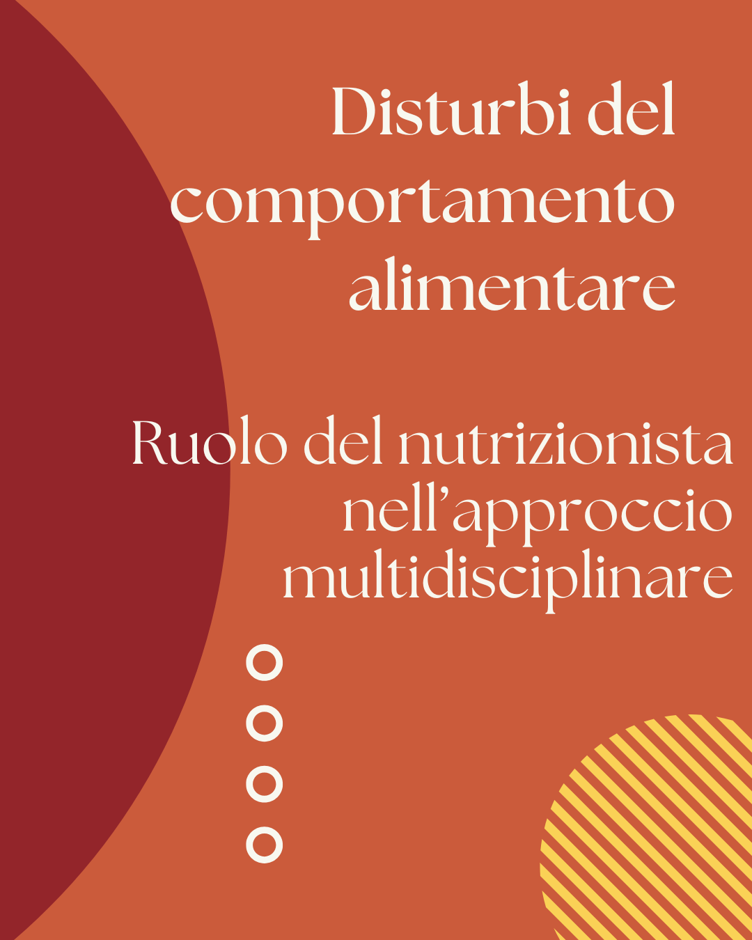 Le forme più diffuse comprendono anoressia nervosa, bulimia nervosa, binge eating disorder e condizioni subcliniche che alterano il rapporto con il cibo. Le ricerche mostrano come tali disturbi siano associati ad alterazioni neurobiologiche, disregolazione degli ormoni della fame e della sazietà, e fattori psicologici e ambientali predisponenti. Il ruolo del nutrizionista in questo contesto è duplice: da un lato valutare lo stato nutrizionale e monitorare le conseguenze cliniche e metaboliche, dall’altro proporre interventi alimentari graduali e sostenibili, che abbiano come obiettivo non solo il recupero ponderale o la stabilizzazione metabolica, ma anche la ricostruzione di un rapporto equilibrato con il cibo.